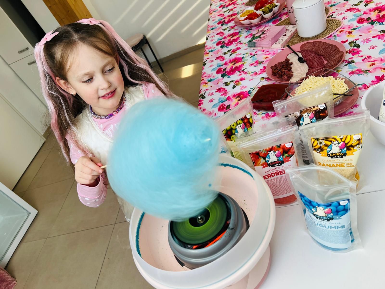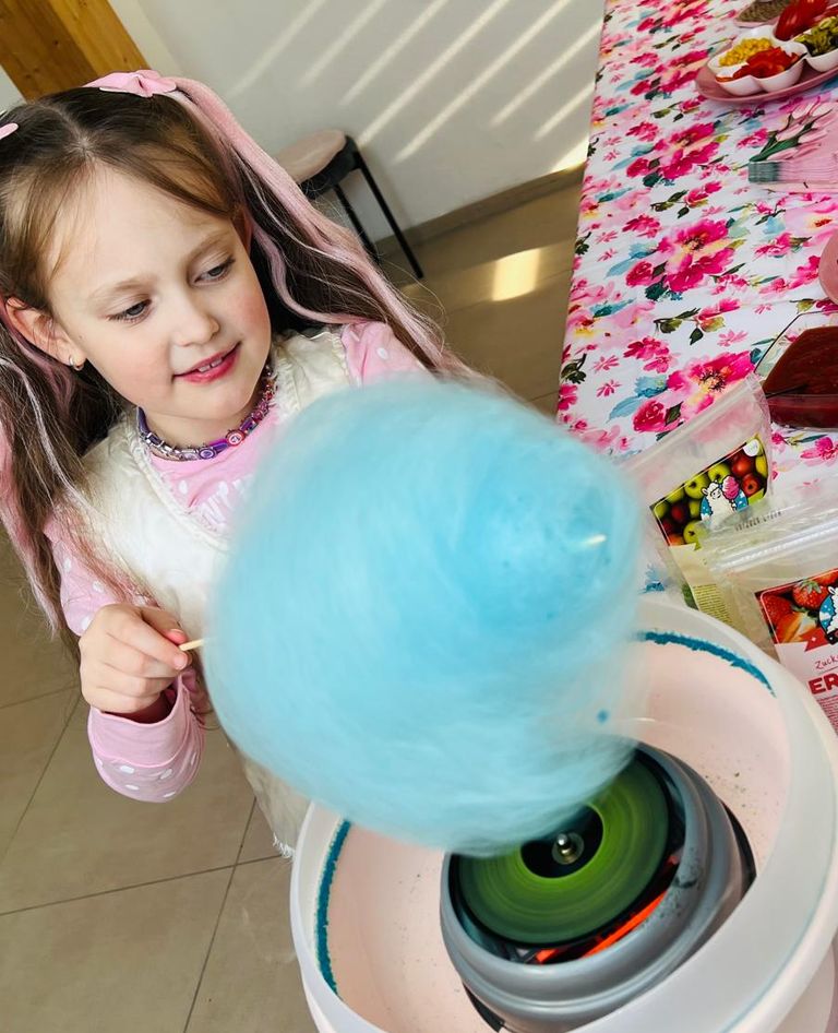 Jedes Kind bekommt 4 Muffins zum Dekorieren mit Fondant und 2 kleine Pizzen, die beliebig belegt werden können. So entstehen mehrere Mini-Projekte – perfekt, um unterschiedliche Ideen auszuprobieren, z. B. Tiere, Blumen oder Herzen. Zum Abschluss darf jedes Kind seine eigene Zuckerwatte drehen und aus mehreren Geschmacksrichtungen wählen.
